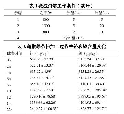 血[6];過量的鎳可引起炎癥、癌癥、癥、系統(tǒng)紊亂、降低生育能力、致畸和致突變等[7];鉻雖是人體必需的微量元素,但高鉻的食用也會引起不適[8]。超微綠茶粉是將達到綠色標準的綠茶茶葉,經超微粉碎形成 200 目(74μm)甚至達到 1000 目(12μm)以上的綠茶超微細粉[9-10]?,F(xiàn)階段我國企業(yè)大多采用球磨方式加工超微綠茶粉,在球磨加工過程中,茶葉被粉碎的同時,研磨材料本身也會發(fā)生變化,從而可能給超微綠茶粉帶來重金屬污染。另外,與傳統(tǒng)茶葉不同的是,超微綠茶粉屬于茶葉深加工范疇,常被以全組分形式加入到食品和化妝品中[11],又因其中的重金屬元素應滿足《食品標準食品中污染物限量》和《茶葉中鉻、鎘、汞、砷及氟化物限量》對茶葉中重金屬限量要求[12-13],因此應對超微綠茶粉加工過程中重金屬污染給予關注,但目前對超微綠茶粉加工過程中的重金屬含量變化未見報道。本文對球磨加工過程中超微綠茶粉的重金屬含量進行檢測分析,同時,采用三組球磨材料不銹鋼球-不銹鋼罐、氧化鋯球-不銹鋼罐、瑪瑙球-尼龍罐對超微綠茶粉進行加工,通過重金屬元素鉻和鎳的檢測,并結合粒徑分析,為尋找合適的球磨材料提供依據(jù)。