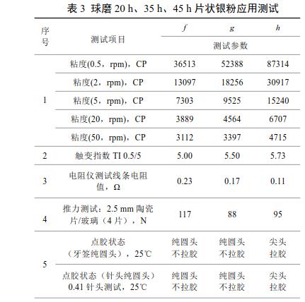 由表3可知,球磨20h、35h片狀銀粉制得IC封裝導(dǎo)電銀膠點(diǎn)膠效果好,無明顯拉膠現(xiàn)象;45h的制得導(dǎo)電銀漿點(diǎn)膠存在尖頭和拉膠現(xiàn)象。同時(shí)可以看出,20h的片狀銀粉觸變指數(shù)低,導(dǎo)電銀膠需要有良好觸變特性便于點(diǎn)膠;45h的片狀銀粉觸變指數(shù)高;而且可以看出35h、45h制得的導(dǎo)電膠的線條電阻值較小。這三款產(chǎn)品推力測試、固化后硬度測試、高低溫冷熱沖擊測試及高溫高濕測試均滿足應(yīng)用。綜合上述各項(xiàng)指標(biāo),球磨35h制得的片狀銀粉制得的導(dǎo)電銀膠均達(dá)到了應(yīng)用指標(biāo)要求。
